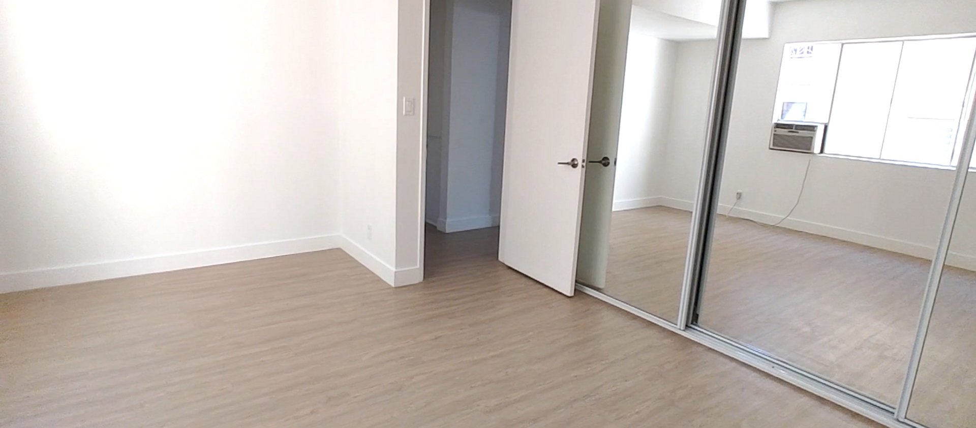 The spacious bedroom includes modern mirrored sliding closet doors, and the hallway offers additional built-in storage for extra convenience.