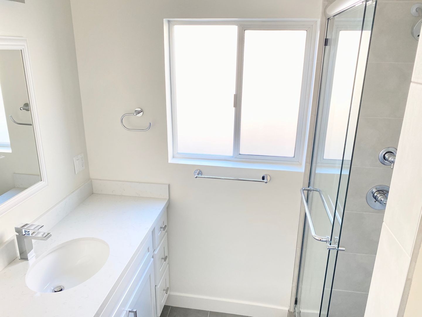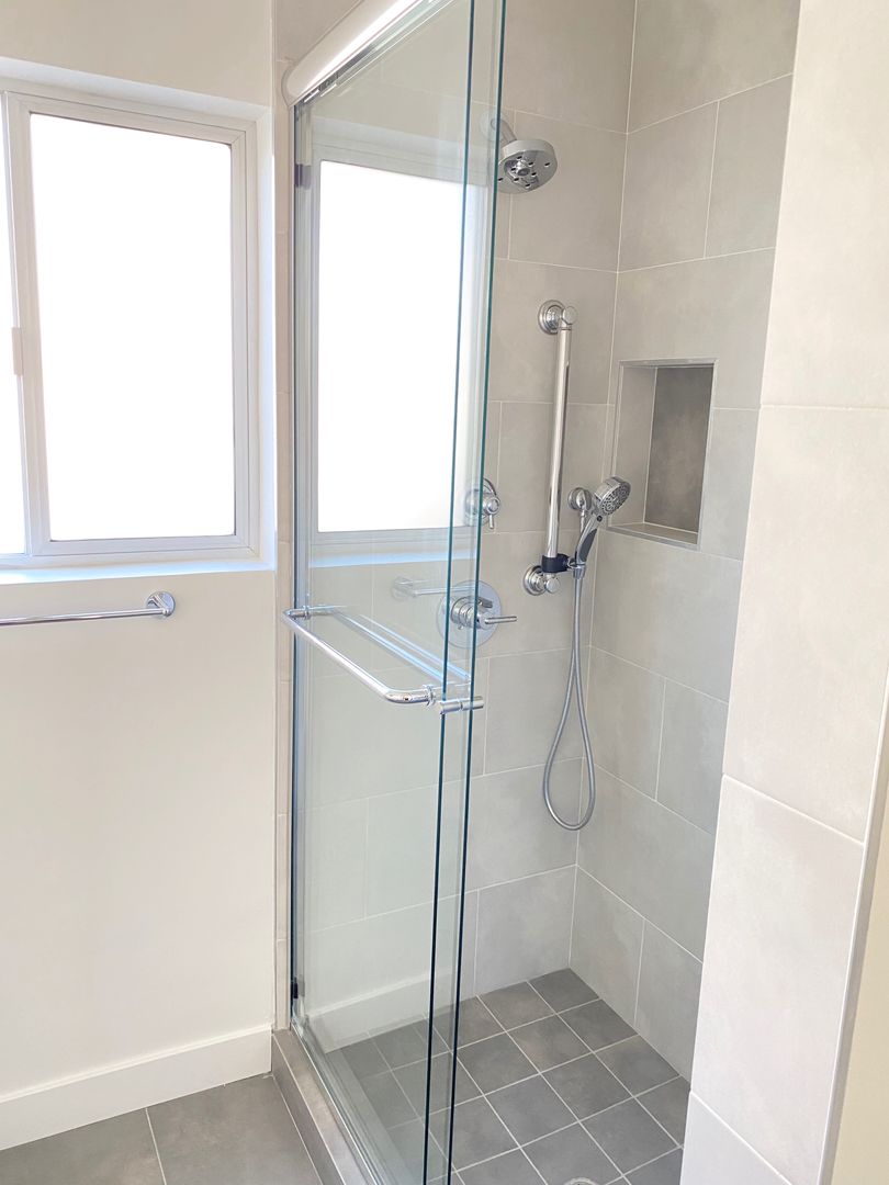 The bathroom has been refreshed with a new tub and modern glass enclosure, adding a clean and contemporary touch.