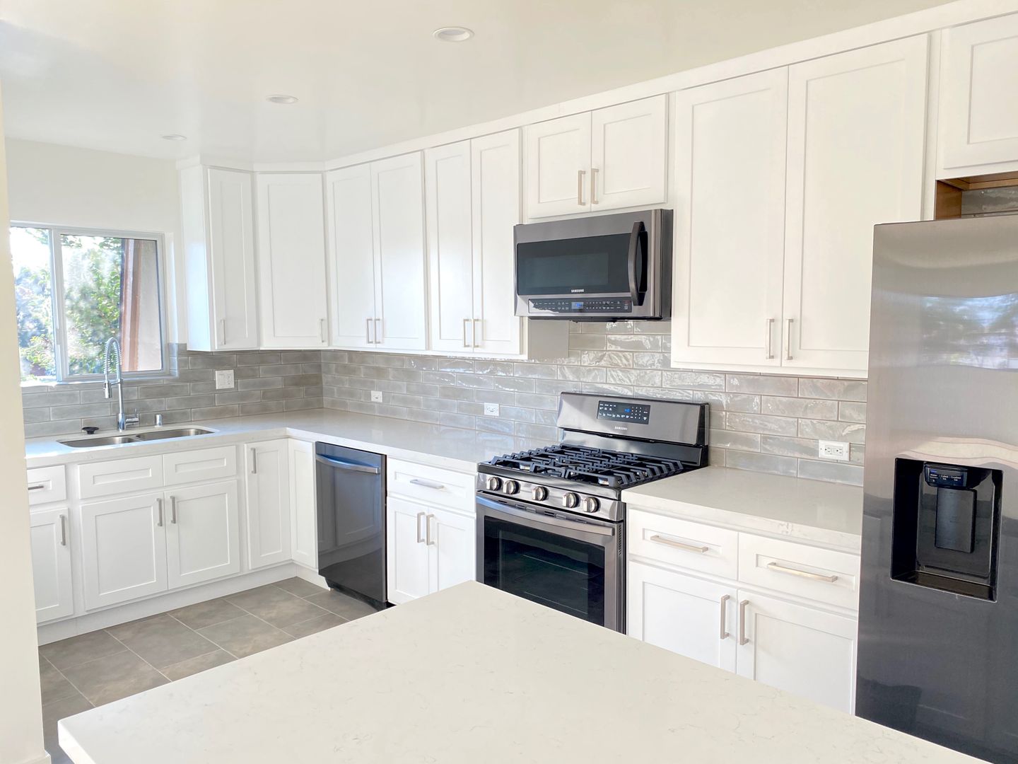 The kitchen has been beautifully updated with brand-new Caesarstone countertops, crisp white cabinetry, and sleek Samsung stainless steel appliances—including a stove, refrigerator, microwave, and dishwasher—perfect for everyday living and entertaining.