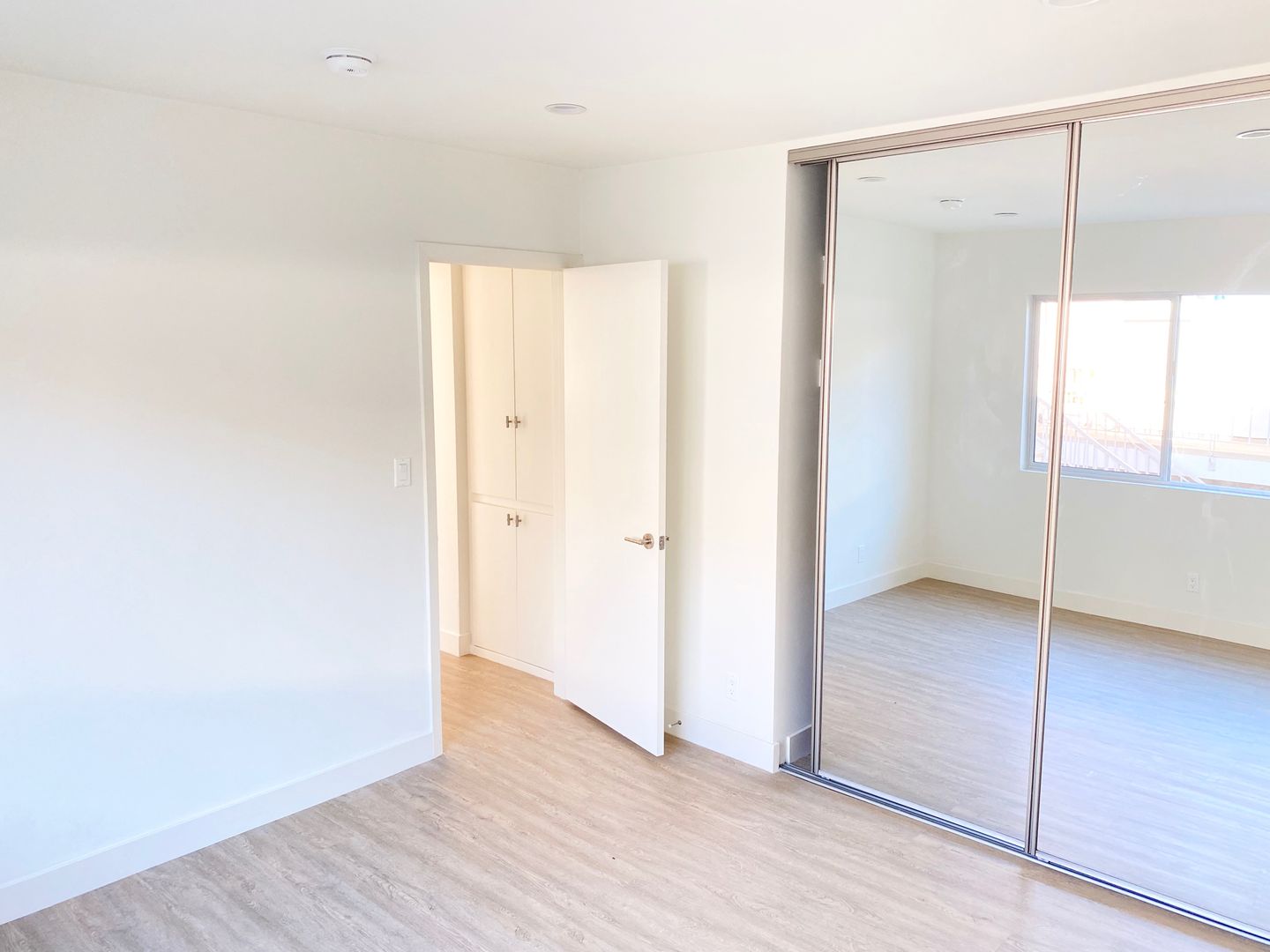 The generously sized bedroom offers mirrored sliding closet doors, while additional built-in hallway closets provide ample storage throughout the home.
