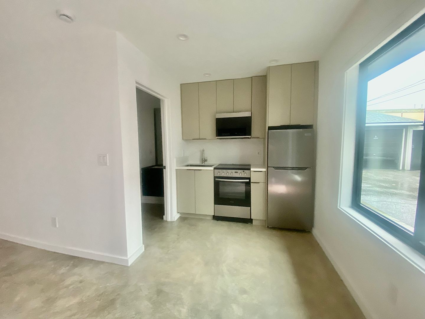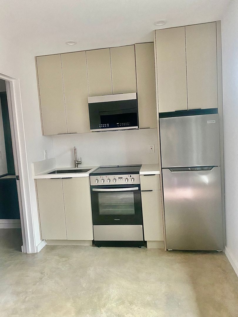The kitchen includes sleek cabinetry, stainless steel appliances, and energy-efficient LED lighting. The bathroom offers a contemporary walk-in shower for a clean, modern feel.