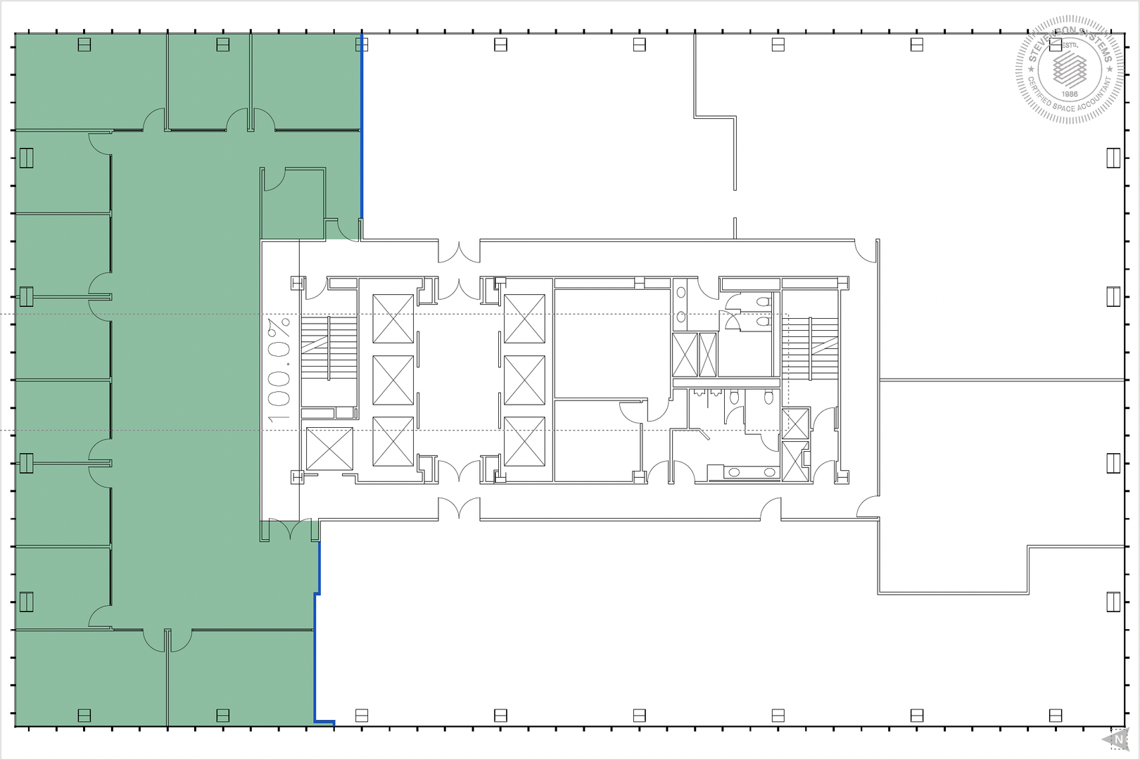 The suite includes three large conference rooms, three breakout rooms, five private offices (exterior facing), a full kitchen, and a server room. The spacious open area offers flexibility for team pods or workstations.