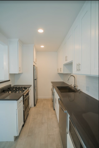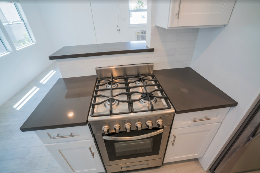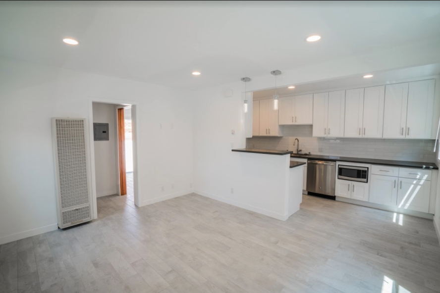 The kitchen features brand-new stainless steel appliances, including a stovetop range, microwave, dishwasher, and washer/dryer combo. Black quartz countertops paired with a shimmering white subway tile backsplash create a modern, elegant look, while ample cabinet space keeps your kitchen organized and functional.