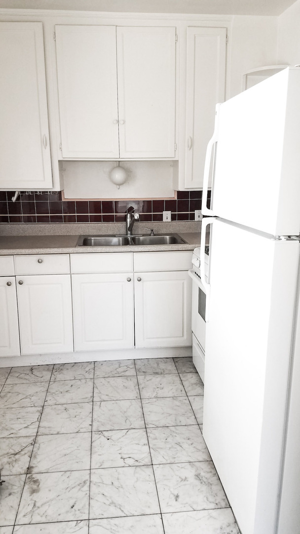 ✔️ Updated kitchen with modern cabinetry, accented backsplash, and white marble tile