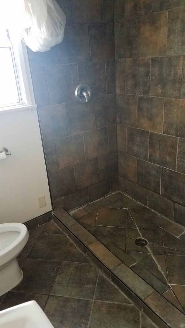 ✔️ Stylish bathroom with slate stone tile and ceiling rain shower