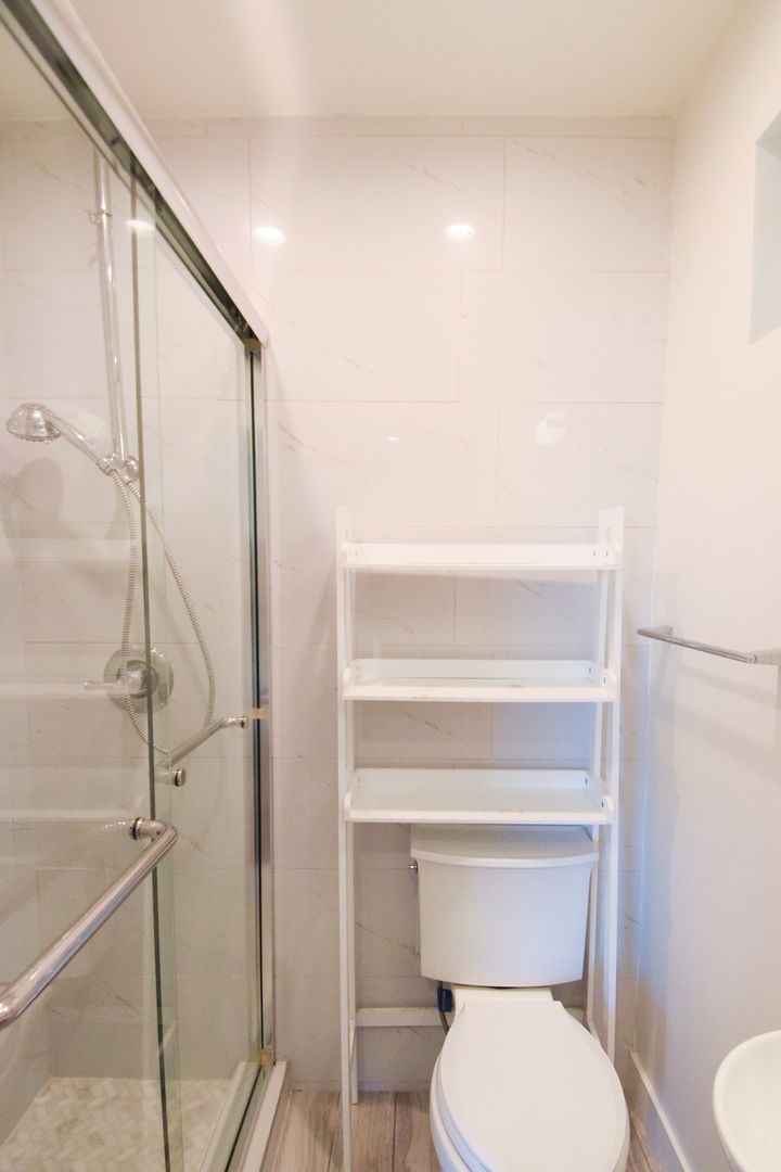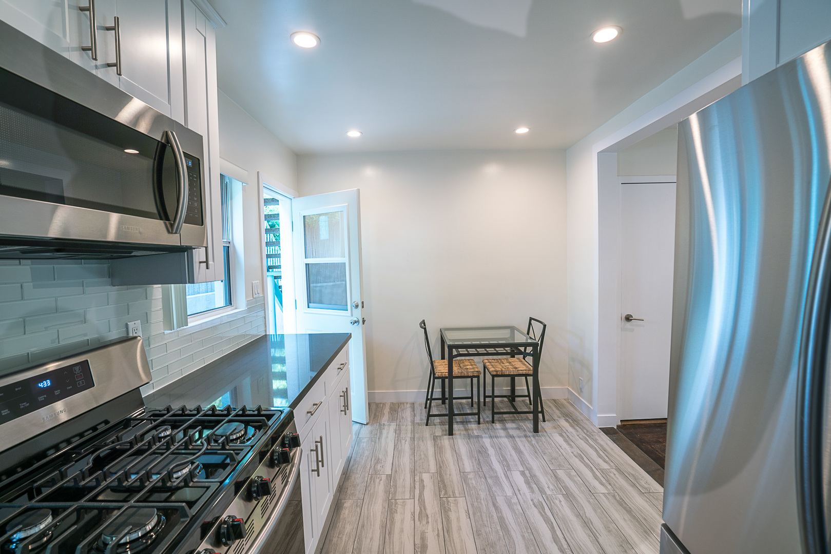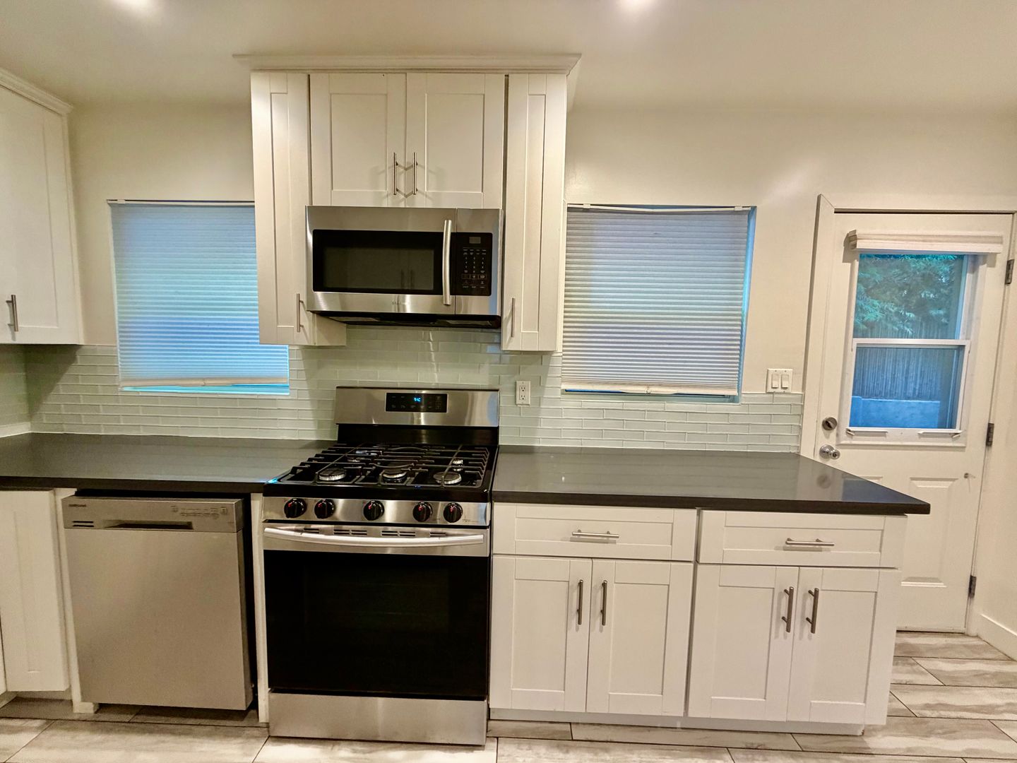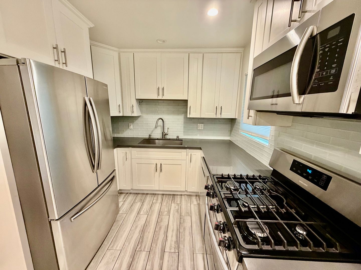 Previously renovated kitchen includes grey marble countertops, Samsung stainless steel appliances, and ample cabinet space for storage. There’s also a dedicated area for a stackable washer and dryer.