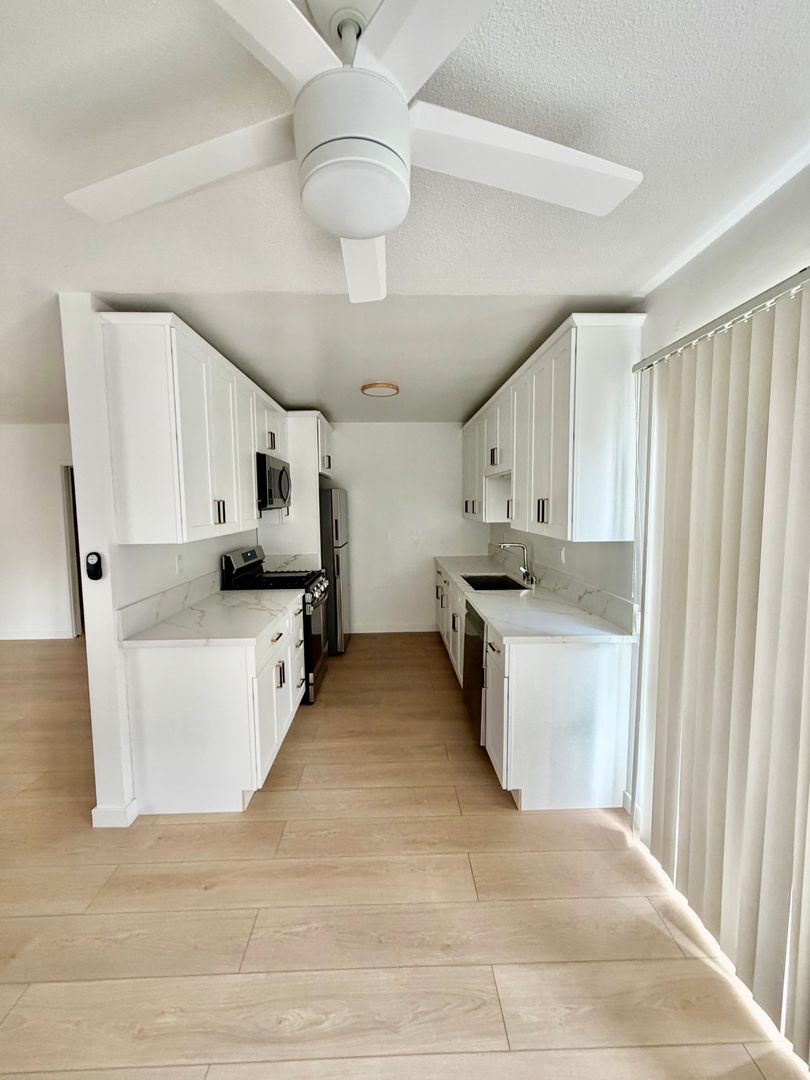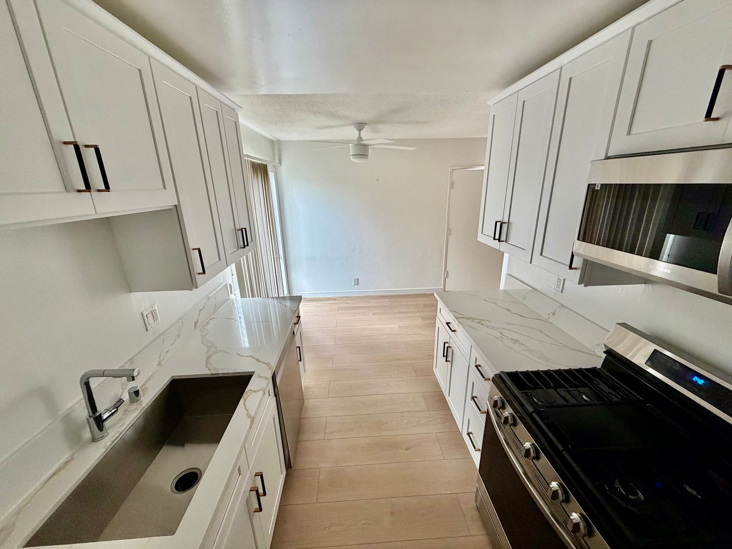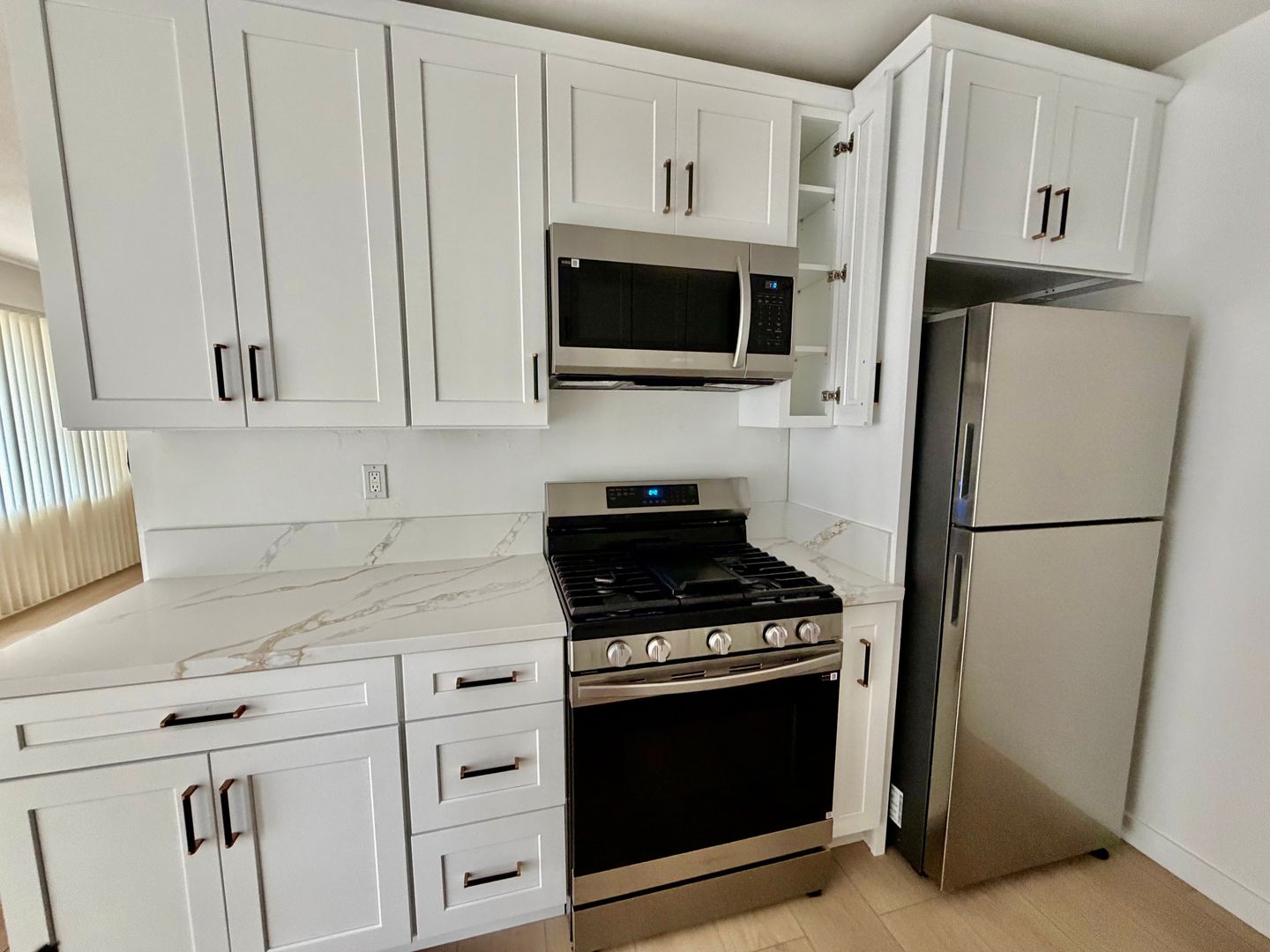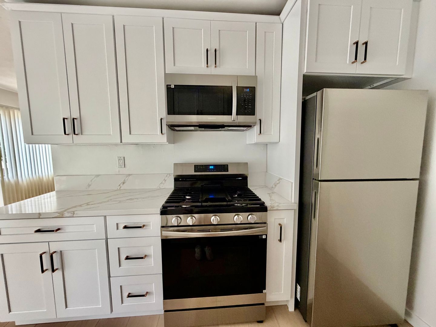 Kitchen has plenty of cabinets with fridge, stove, dishwasher and microwave.