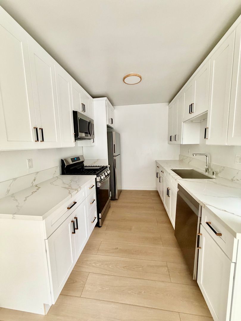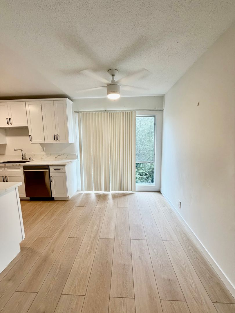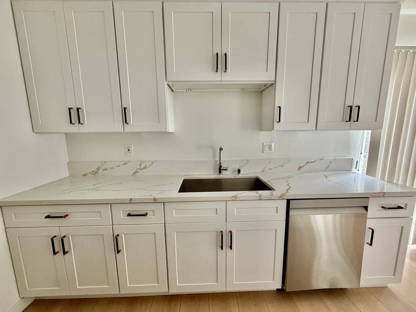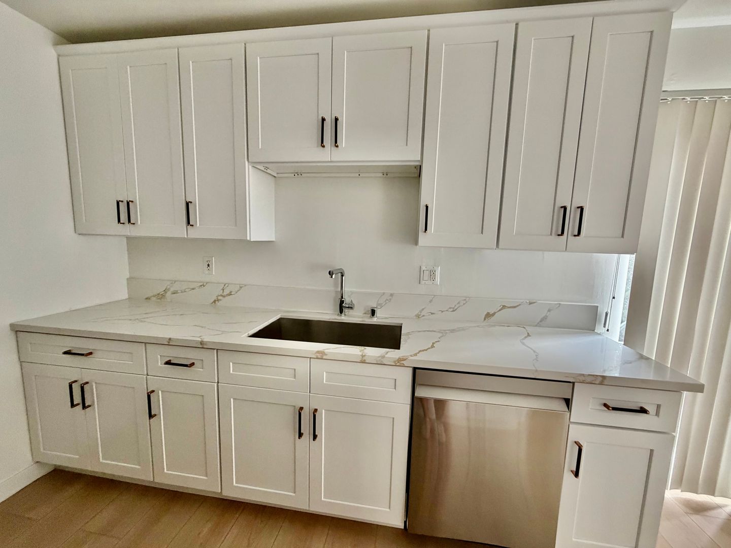 Kitchen has plenty of cabinets with fridge, stove, dishwasher and microwave.
