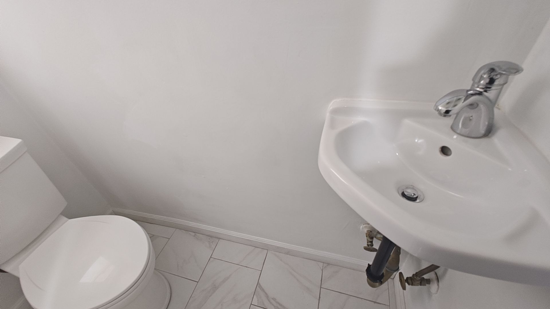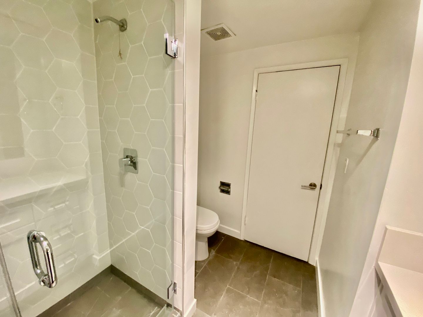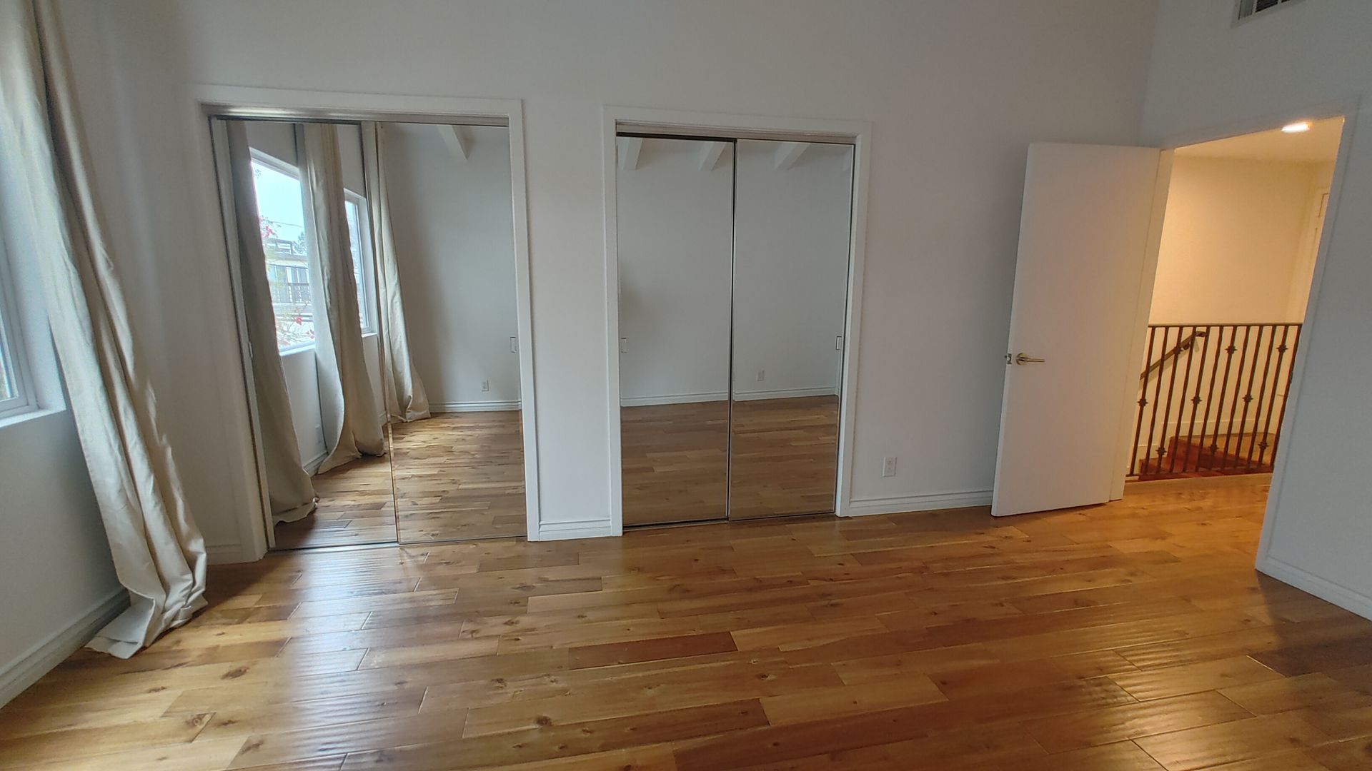 Enjoy the comfort of in-unit washer and dryer, along with a convenient powder room near the entry for guests. Upstairs, you’ll find two spacious bedrooms with hardwood flooring, high ceilings, and exposed wood beams that add a unique architectural touch. The primary bedroom includes custom-built closets, and both bedrooms share a well-appointed bathroom.