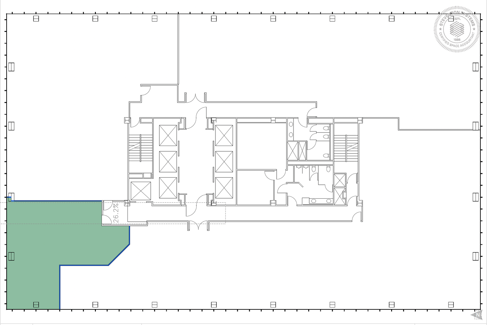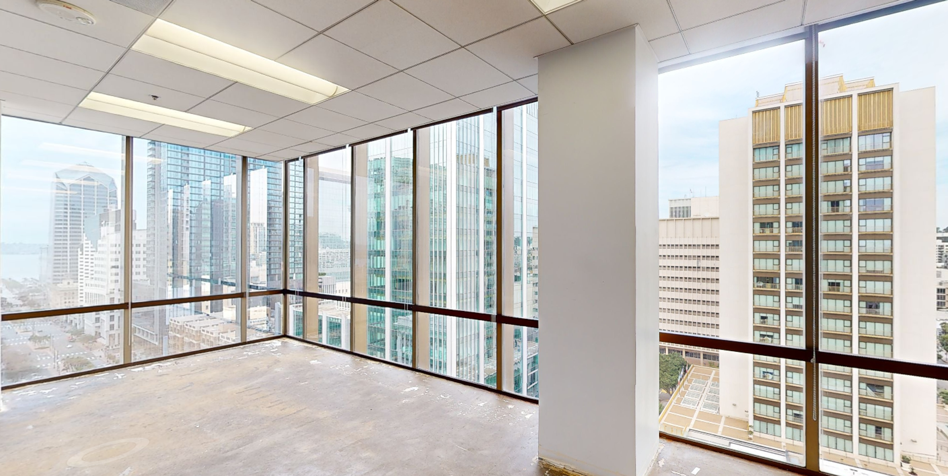 High floor, open space unit with white walls and a view down Broadway to the bay.